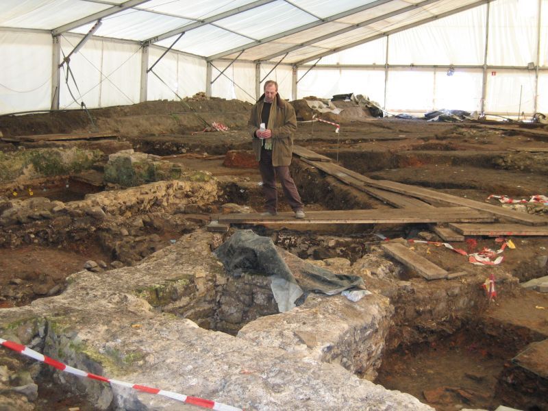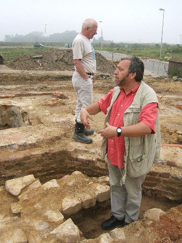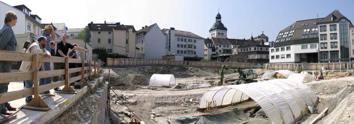 Ein Team von 50 Ausgräbern, die für dieses Projekt eingestellt wurden, untersuchen ein 3,7 ha großes Areal im römischen Zivilvicus. Der Grabungsleiter Dr. C. Ulbert gab einen Überblick über die archäologische Ausgangssituation und erläuterte die Dokumentationsmethode (die Systeme ArchäoCad und ArchäoData der Fa. Arctron sowie PhoToPlan kommen hier erfolgreich zum Einsatz). Anschließend stellte er die umfangreiche Fundbearbeitung vor und führte über die Grabungsfläche mit der gut erhaltenen Badeanlage, einem gallo-römischen Umgangstempel und einem Ziegelofen. Außerdem wurden unter teilweise bis zu vier Meter mächtigen Schichtpaketen Fundamente von 8 Streifenhäusern, Kanalsysteme und äußerst fundreiche Abfallgruben von bis zu 50 m Durchmesser untersucht.