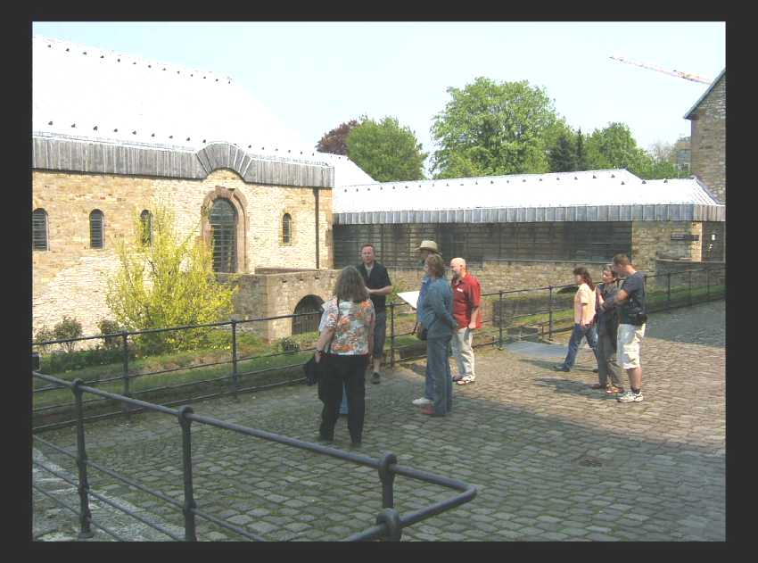 Am Nachmittag besuchten wir die unter einem 1000 qm großen Zelt durchgeführte Stadtkerngrabung der Firma Goldschmidt am Elisengarten, unweit südöstlich des Doms gelegen. Eingangs erläuterte der Stadtarchäologe, Herr Schaub, die Rahmenbedingungen dieser von der Stadt Aachen beauftragten Großgrabung. Anschließend führte der Grabungsleiter der Firma Goldschmidt, Herr Gary White M.A., über die Grabung und erklärte die komplizierten Befundsituationen, bestehend aus den erhaltenen Überresten römischer Gebäude mehrerer Steinbauphasen, den Baustrukturen u. a. der Doppelklosteranlage Stavelot/Malmedy sowie mittelalterlichen Grubenkomplexen mit gut erhaltenen holzverschalten Gruben oder Kellern, bis hin zu neuzeitlichen Bauresten.