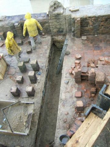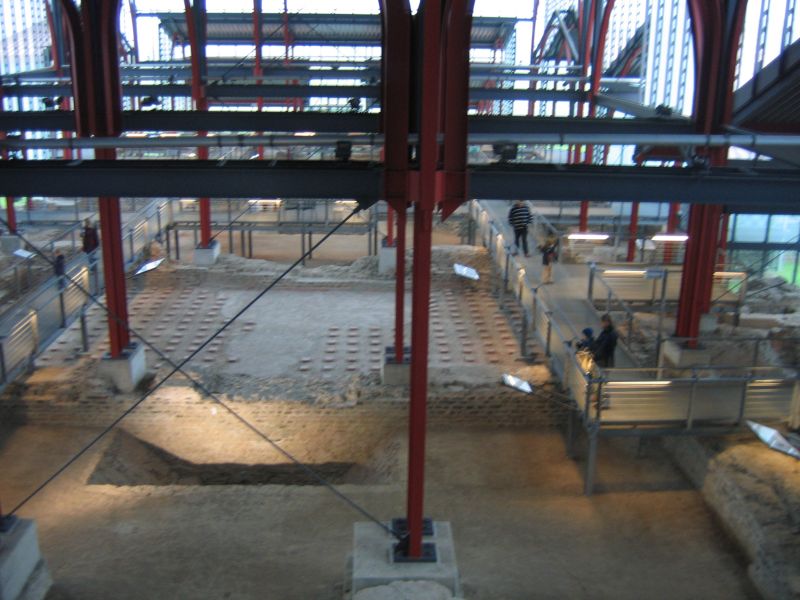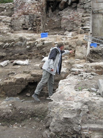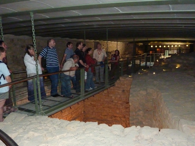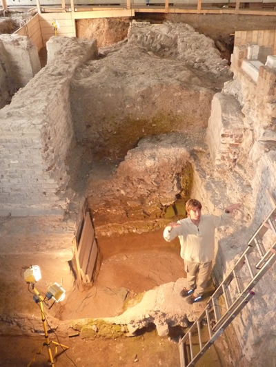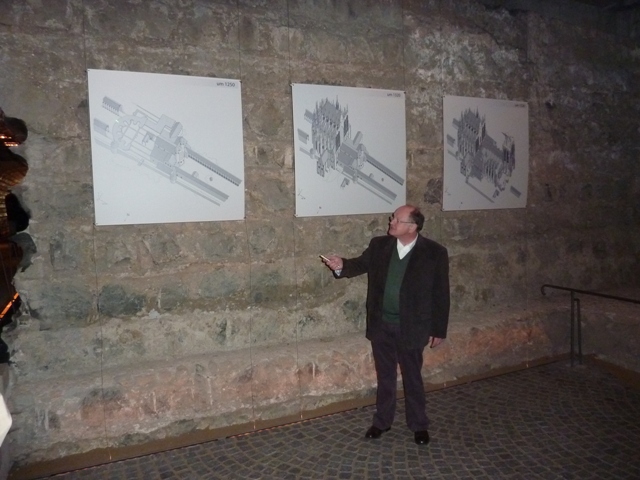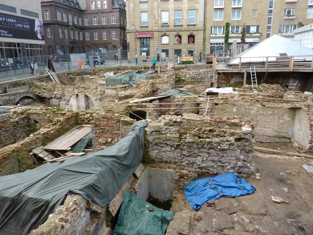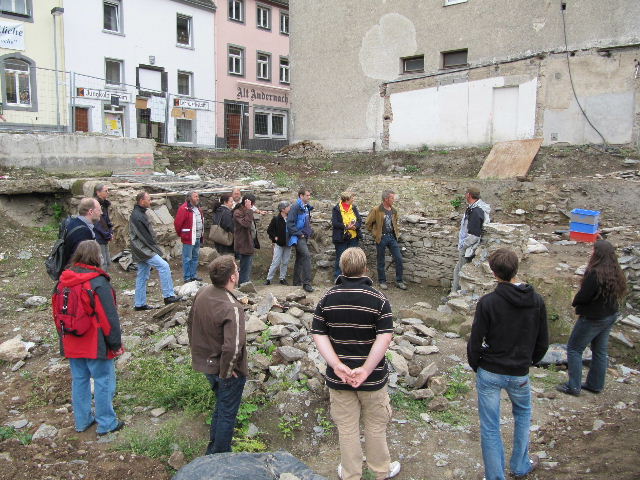 Am Vormittag besuchten wir die Archäologische Zone im Bereich des zukünftigen neuen archäologischen Museums. Im Rahmen der Regionale 2010 realisiert die Stadt Köln und das Land NRW auf und unter dem Rathausplatz eine neue Museumslandschaft mit der Präsentation des großen römischen Statthalterpalastes und einem Museumsneubau für das jüdische Kulturerbe. Herr Michael Wiehen M.A., einer der beiden Grabungsleiter, erläuterte die Planungen und den aktuellen Stand der archäologischen Untersuchungen mit den umfangreichen und noch sehr gut erhaltenen Ruinen des römischen Statthalterpalastes, den Resten der jüdischen Synagoge bis hin zu der umfangreichen neuzeitlichen Bebauung, die in vielen Teilen noch die stehenden römischen Mauern genutzt hat.
