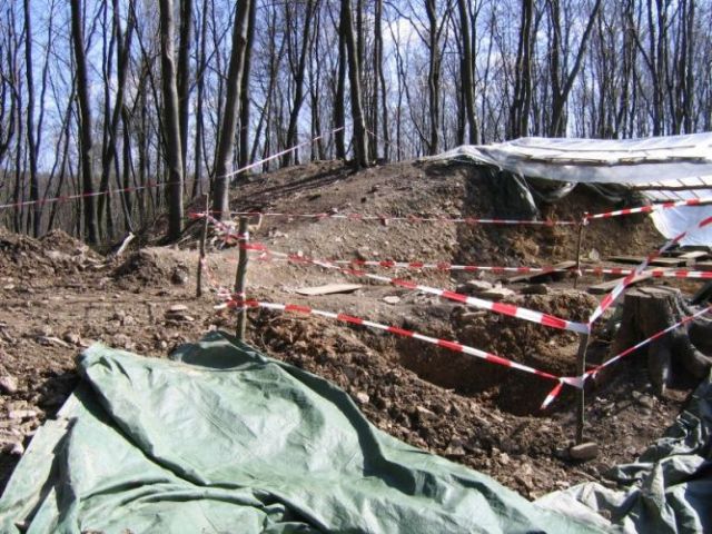 Vor dem halbkreisförmigen Wall lag ein 3 m tiefer Graben mit davor wiederum sternförmig angelegten fünf weiteren kleineren Gräben. Während der Untersuchungen im Wallschnitt zeigte sich als älteste Phase eine mit Bruchsteinen gefüllte Holzkonstruktion. Eine erste 14C-Holzkohlenprobe datiert diesen Befund überraschend auf etwa 50 v. Chr.