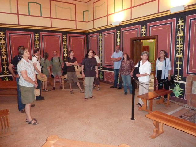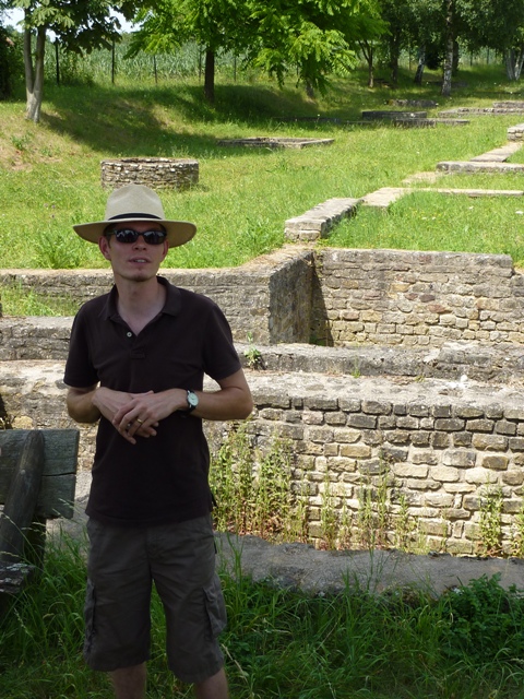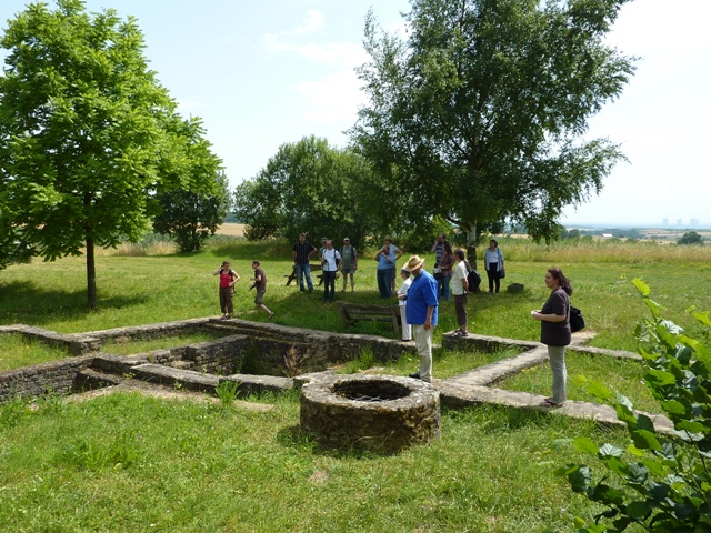 Nach einer Stärkung in der römischen Taverne der villa fuhren wir am Nachmittag weiter ins Großherzogtum Luxemburg zum gallo-römischen Vicus Ricciacus bei Dalheim. Unser Kollege Matthias Paulke führte über diese große an der römischen Fernstrasse vom Mittelmeer zum Rhein liegende Siedlung. Seit 1977 wird dieser Komplex in zahlreichen Grabungskampagnen untersucht. Dabei wurden neben den Siedlungsbefunden auch Gräber, ein Tempel und ein Theater freigelegt. Das Theater fasste etwa 3.500 Zuschauer und ist heute mit einem Schutzdach überbaut. In einem Schauraum wird auf ausführlichen Infotafeln die Grabungsgeschichte dargestellt.