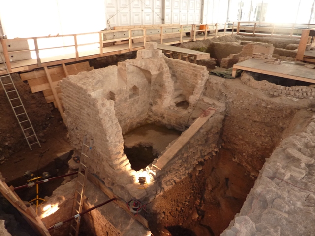 Das römische Bad wird in mehrere Großblöcke geteilt, die gehoben und innerhalb der Baugrube zur Zwischenlagerung versetzt werden, um dann ihren endgültigen Platz im Bereich des zukünftigen Hotelbaus zu erhalten.